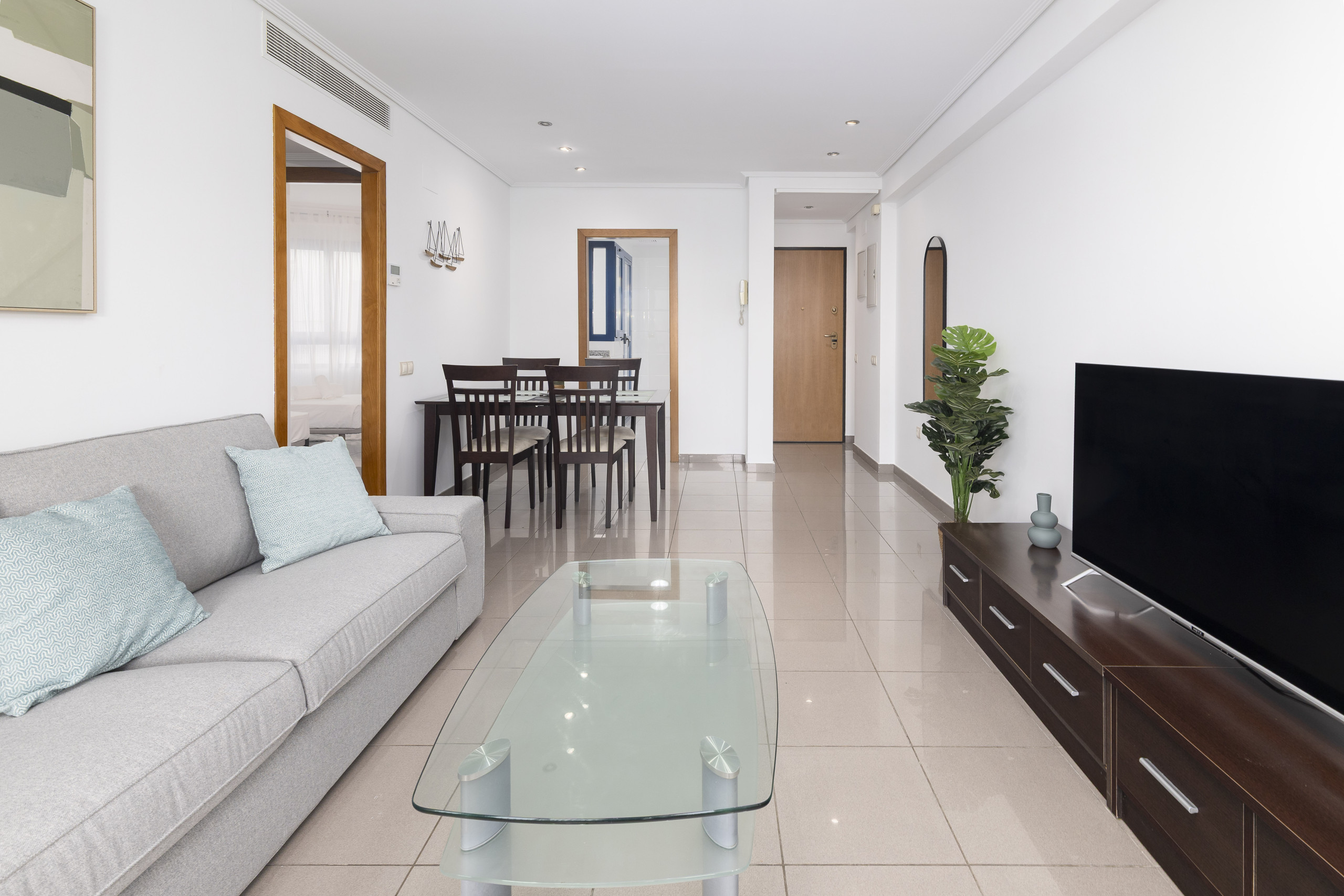 - Bonito salón con sofá, TV-HD, mesa de comedor con 4 sillas, espejo de cuerpo entero y acceso directo a la terraza con vistas a la Piscina y Playa de la Patacona, equipada con mesa redonda y 4 sillas.