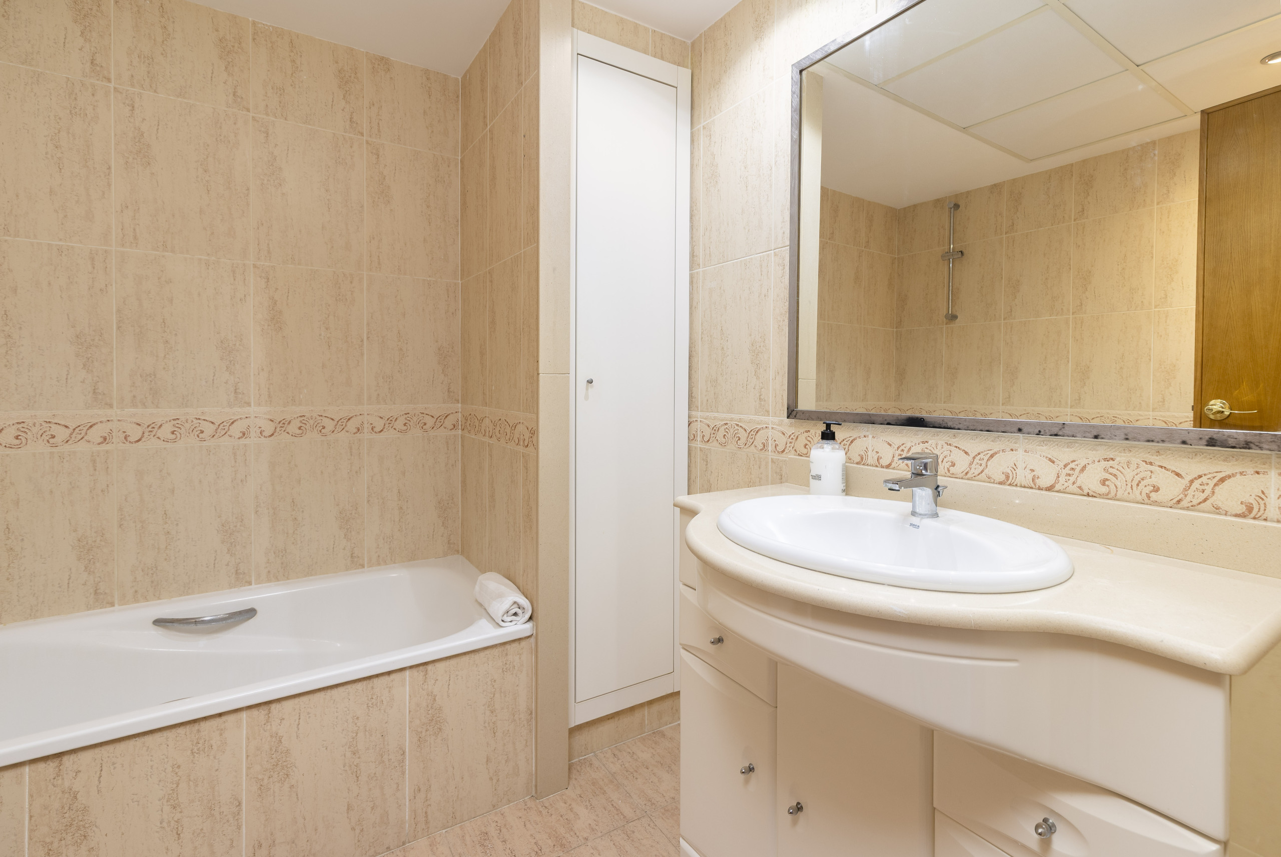 - Baño completo con bañera y mampara, inodoro, bidet, lavabo con espejo y armario.