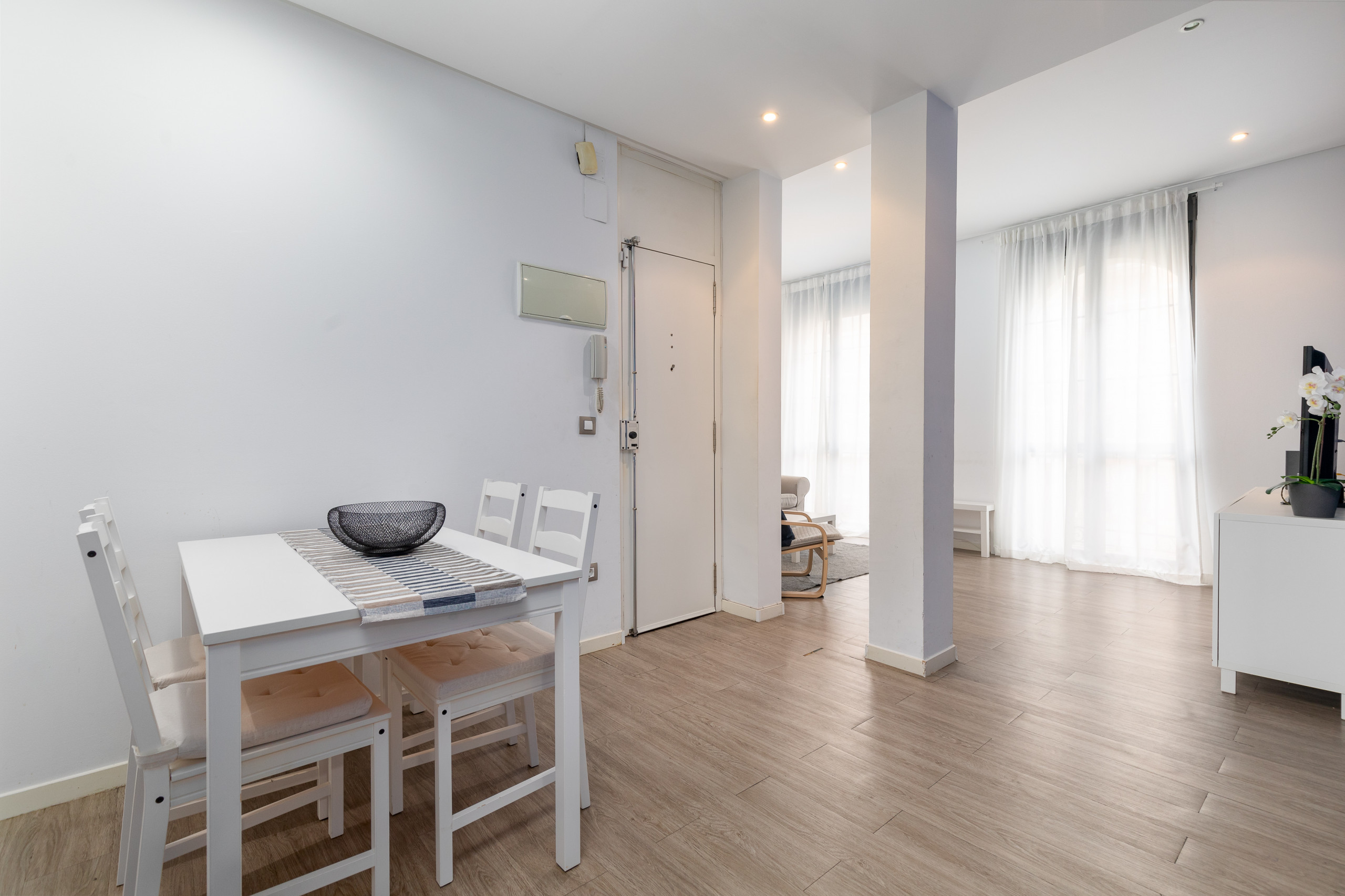- Confortable y luminoso salón con sofá, butaca, TV HD, mesa de comedor para cuatro personas y acceso a balcón.