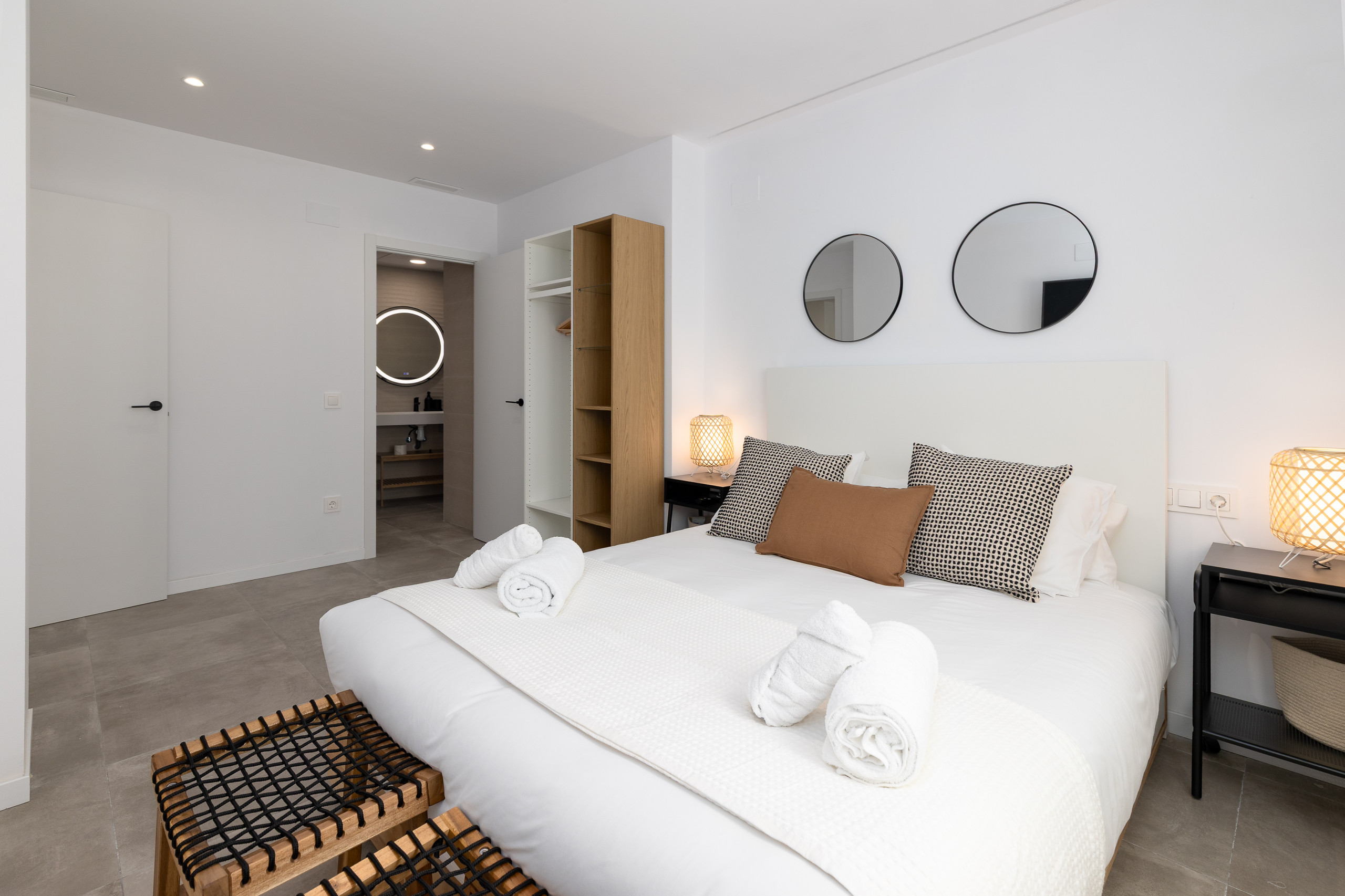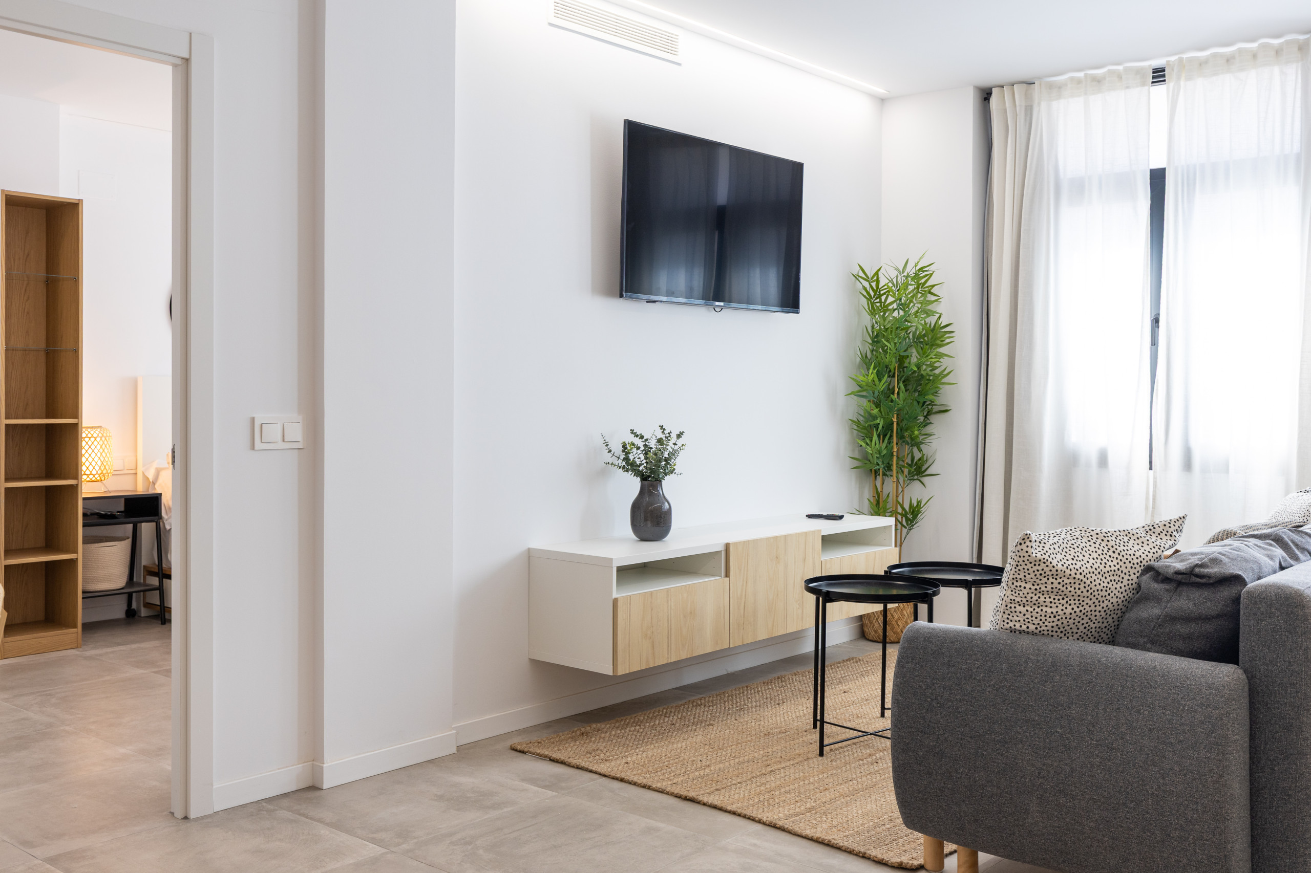 - Dormitorio independiente: Habitación amplia y separada, equipada con cama de matrimonio, segunda Smart-TV propia, mesitas de noche y un gran armario-estantería abierto para almacenaje.