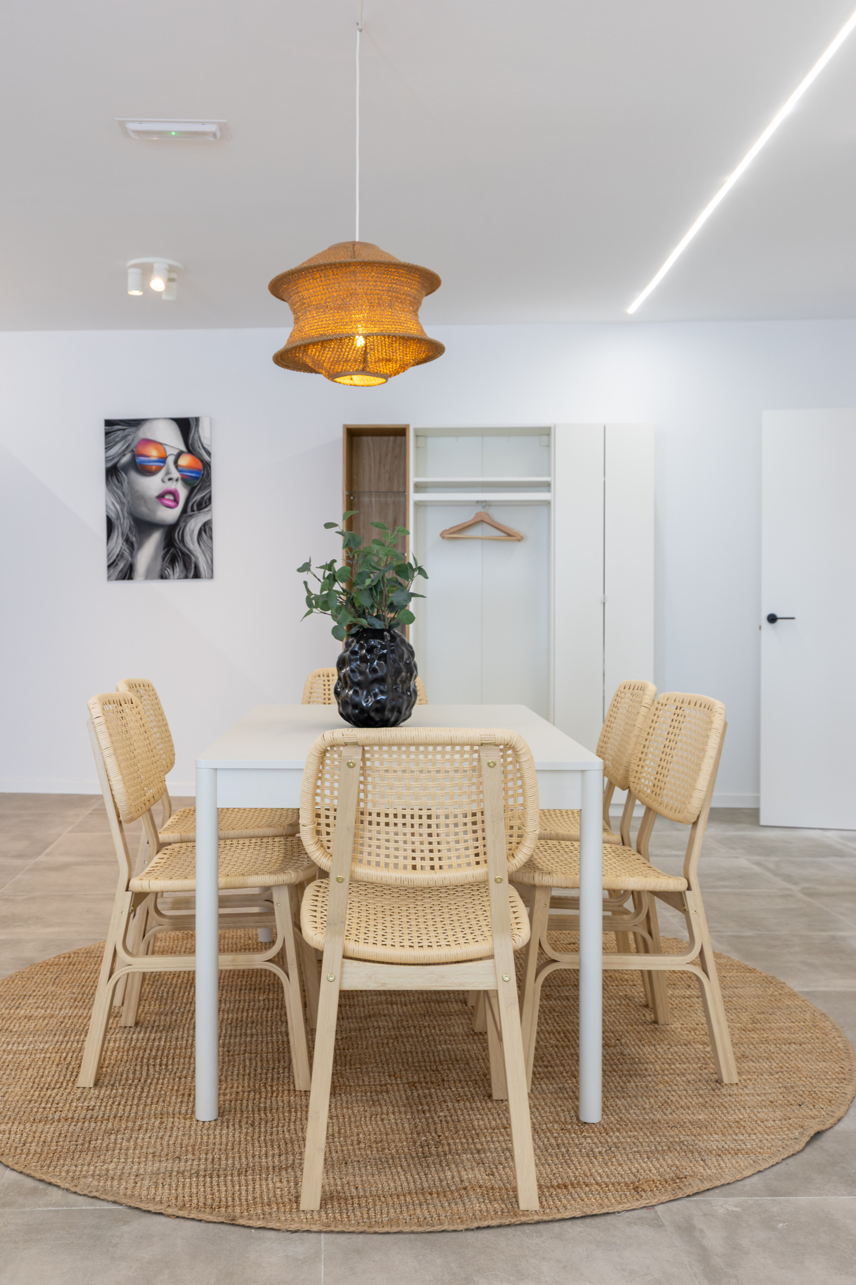 - Zona de estar: Amplio salón comedor con Smart-TV, equipado con un confortable sofá y una zona de comedor con mesa rectagular integrada en el diseño, con capacidad para 6 personas y cama abatible de 150x190cm.