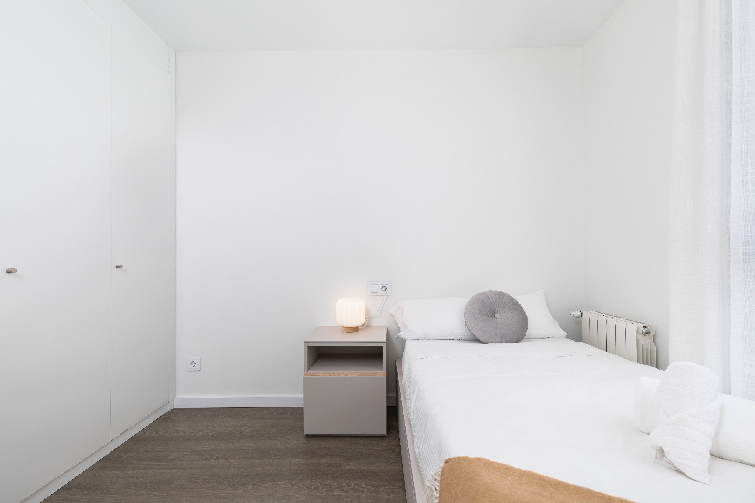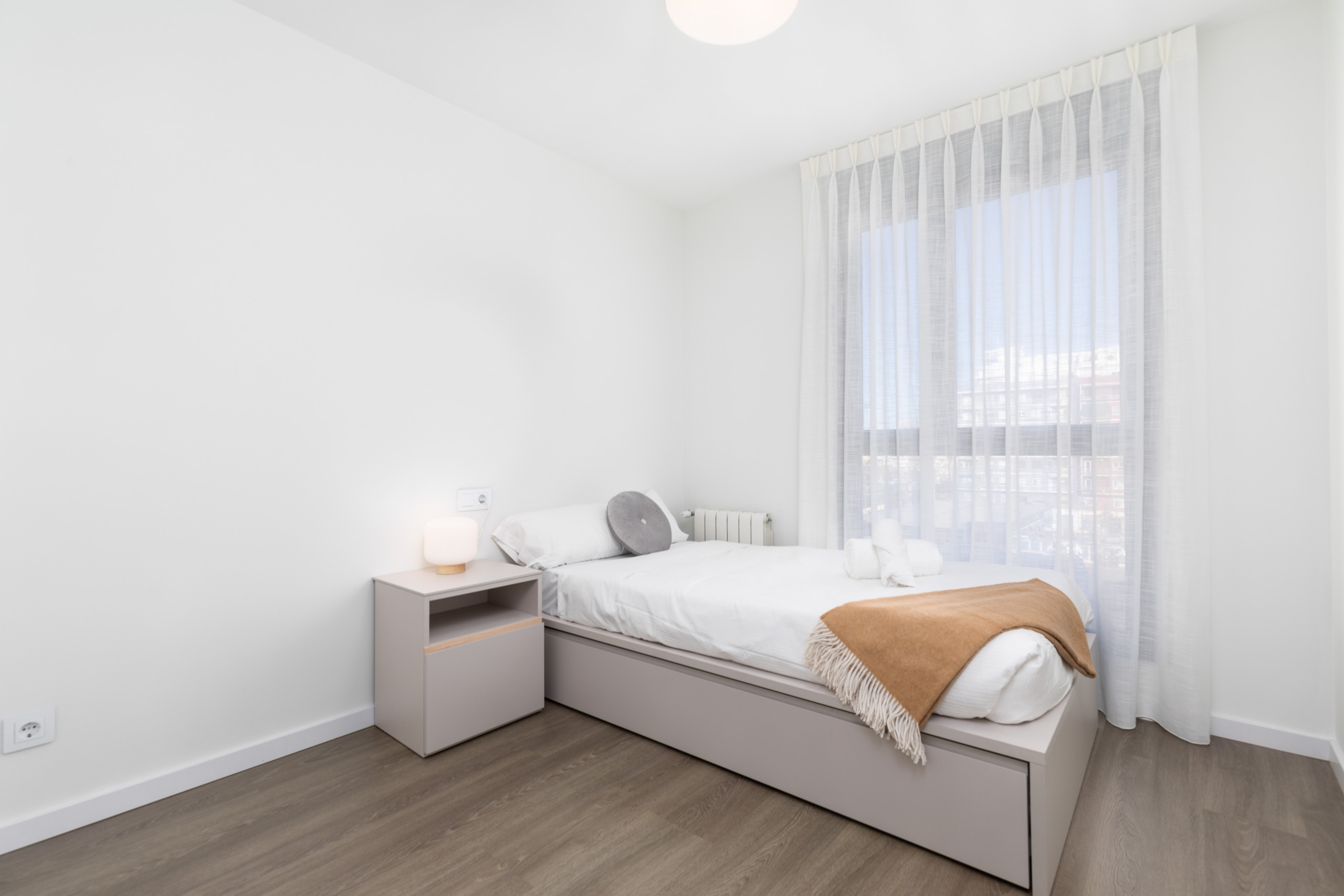 - Tercer dormitorio con cama individual de 90x200cm, armario y acceso a balcón.