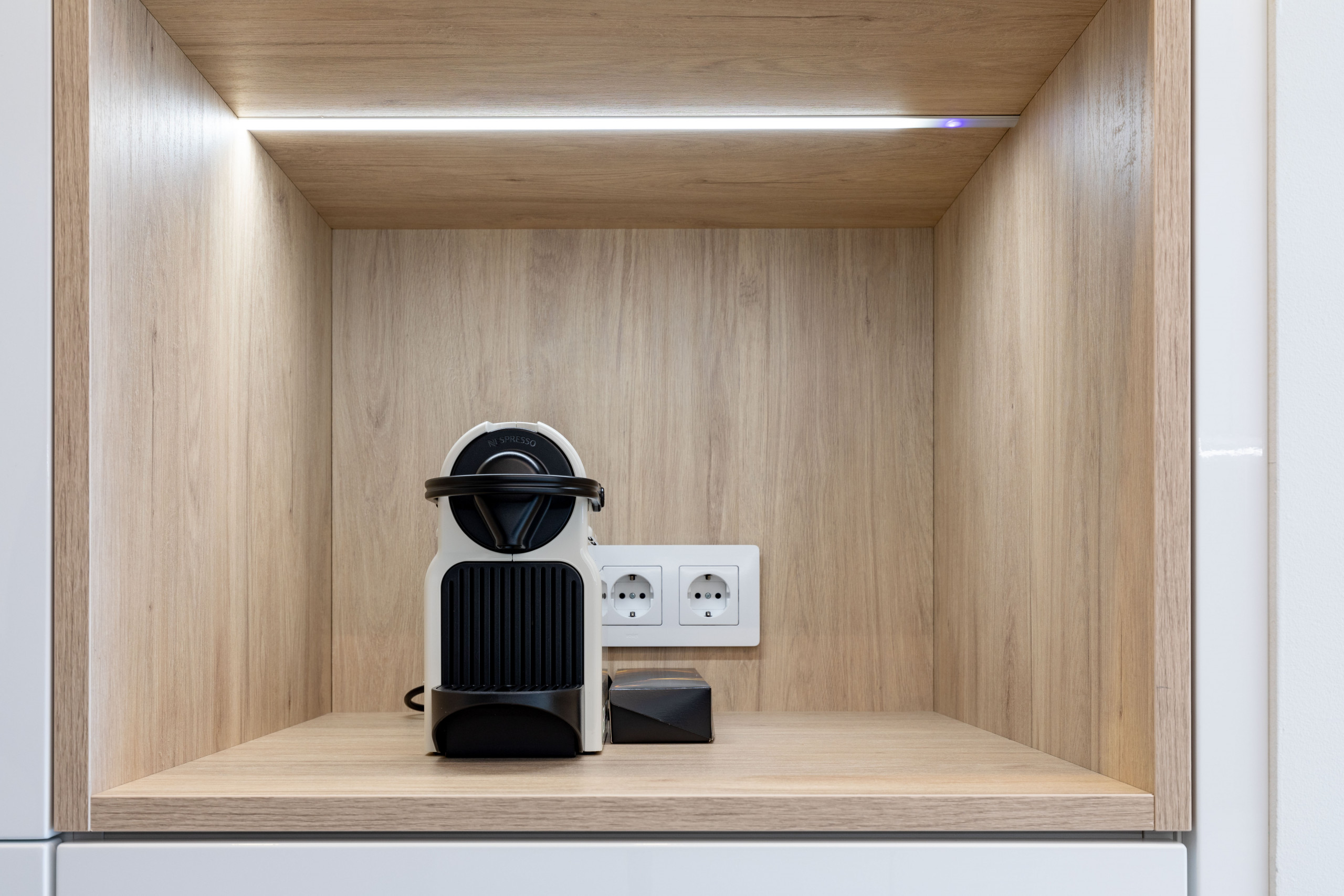 - Cocina abierta al salón totalmente equipada con pequeños electrodomésticos (cafetera dolçe gusto, tostador, exprimidor, hervidor de agua y batidora).