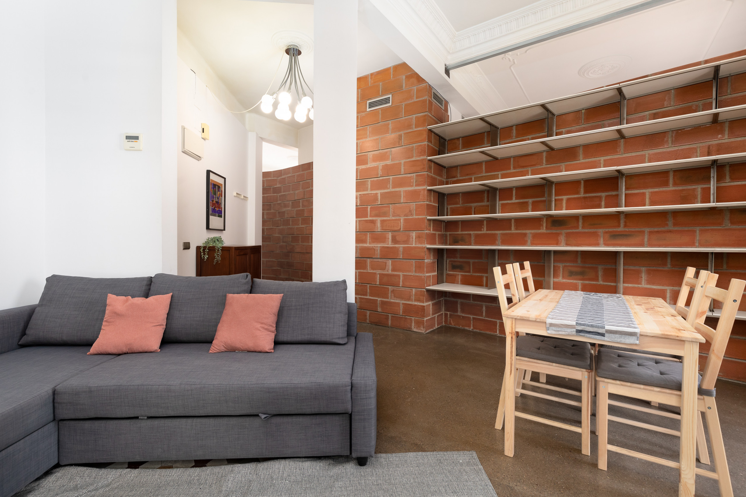 - Spacious and bright living room with sofa, HD TV, dining table for four people, shelves and access to a balcony.