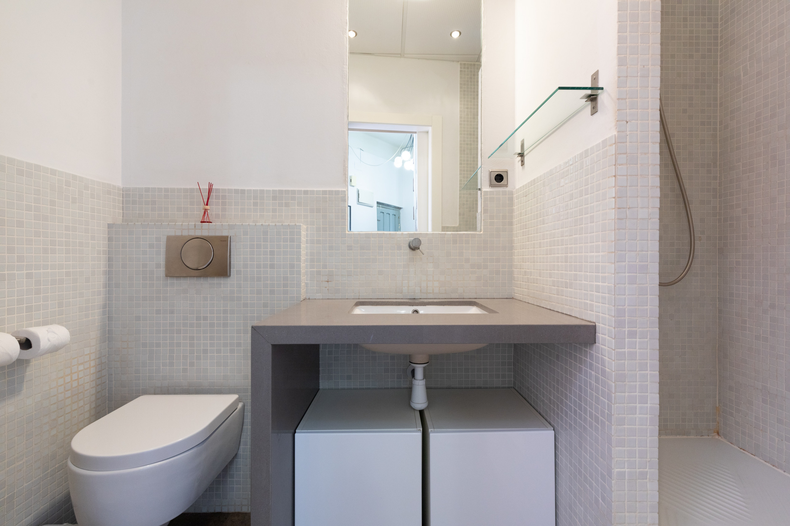 - Practical and complete bathroom with shower, sink, mirror and toilet.