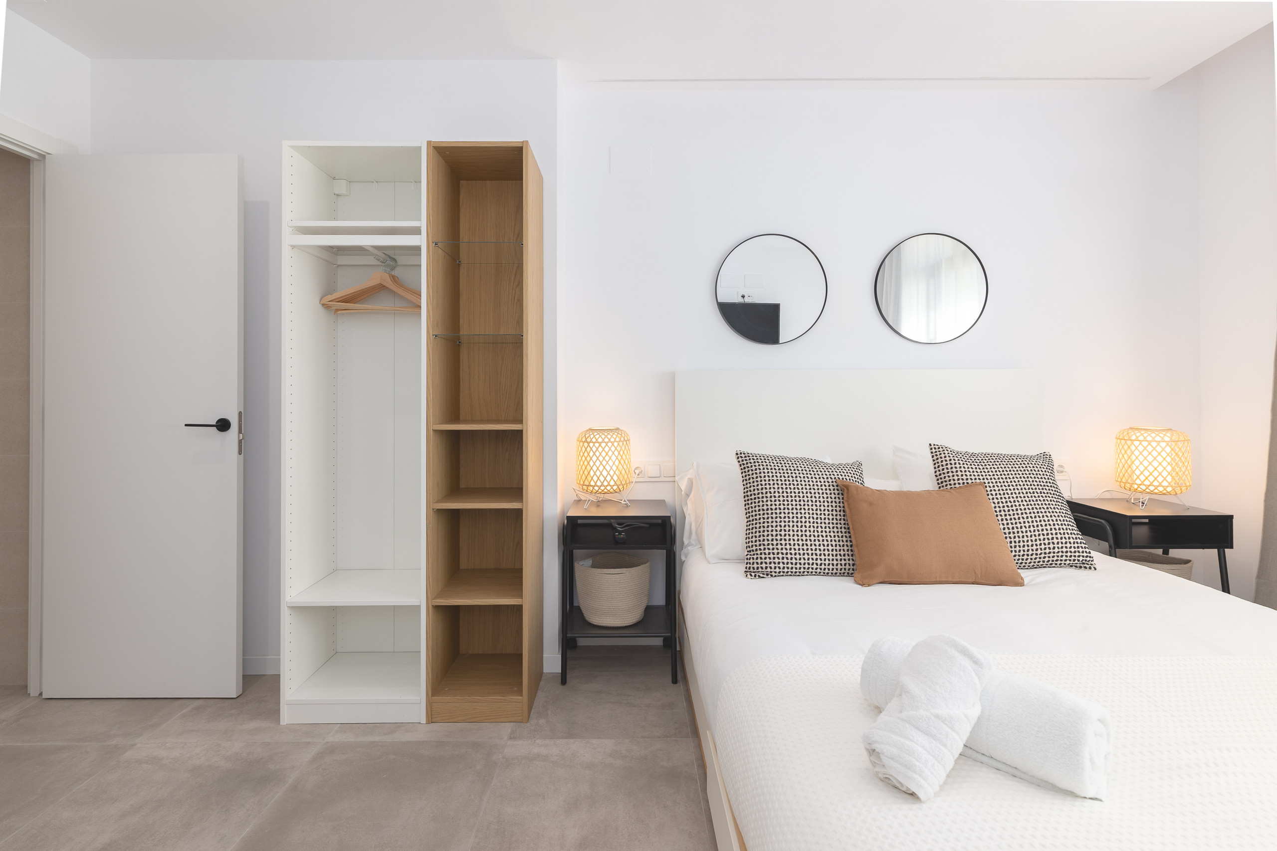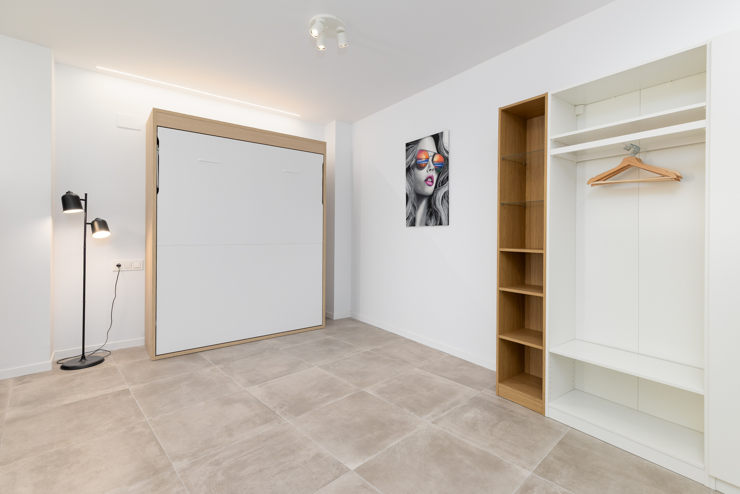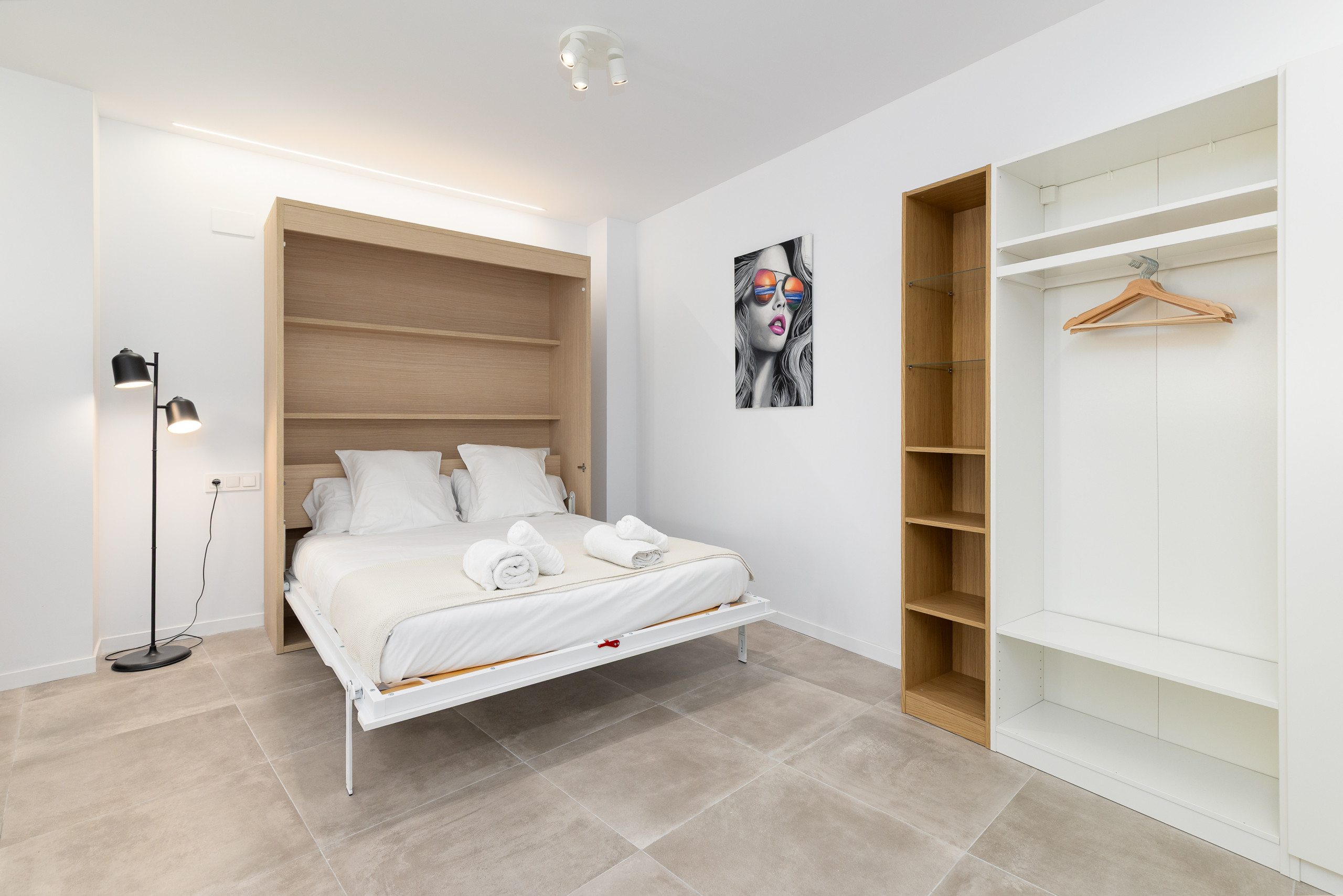 - Independent bedroom: Spacious and separate room, equipped with double bed, second own Smart-TV, bedside tables and a large open wardrobe-shelving unit for storage.