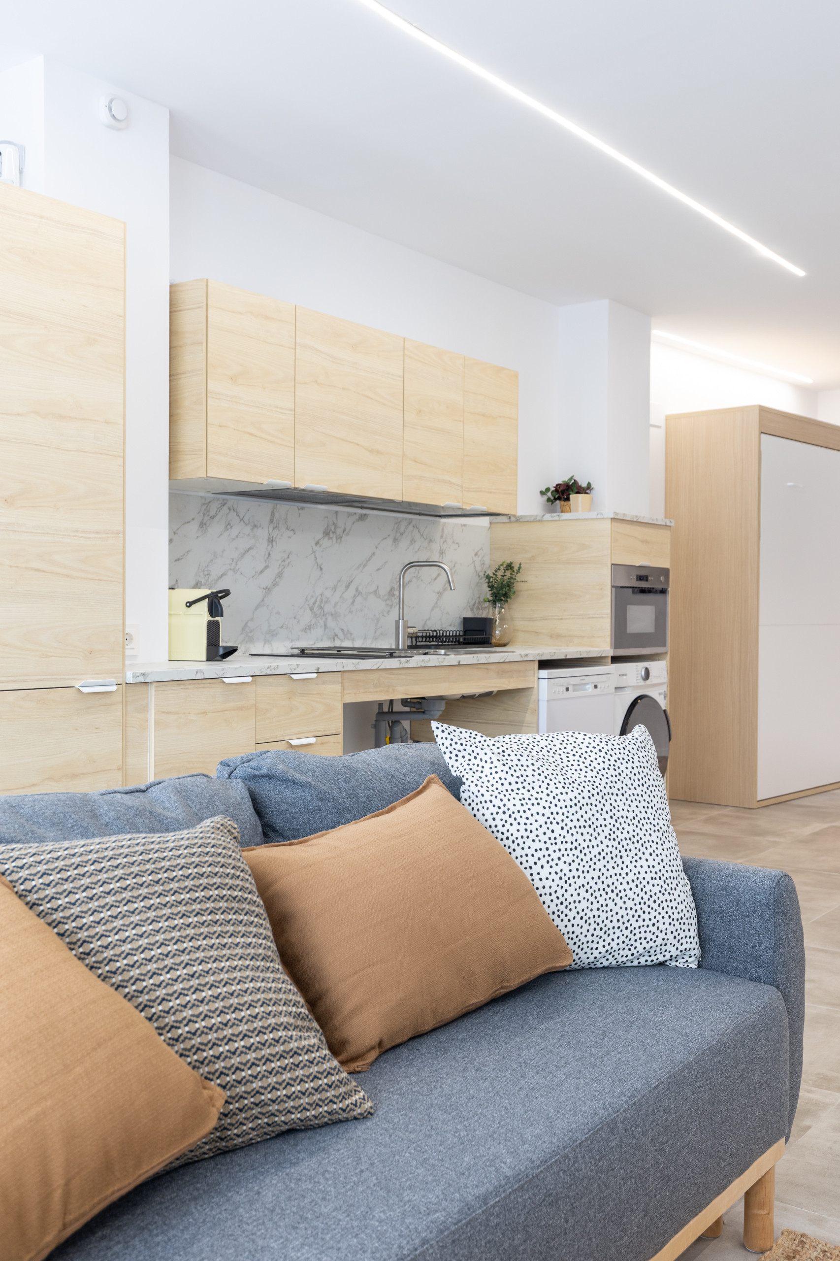 It is provided with bed linen, 1 hand towel and 1 bath towel per person, welcome kitchen amenities (1 scouring pad, 1 kitchen cloth, 2 bin bags, washing machine and dishwasher soap, 2 toilet rolls), bathroom amenities (hand gel), coffee capsules and a 1.5l bottle of mineral water.