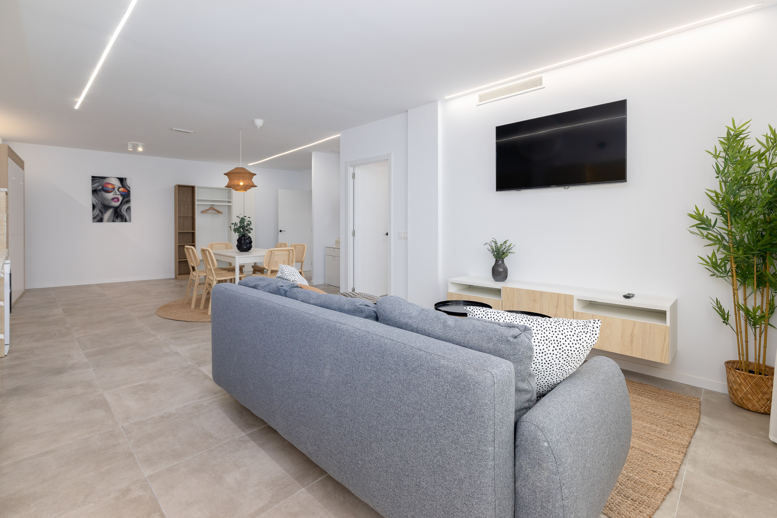 - Living-dining room with 140x190cm double sofa bed, dining table, HD-TV Smart TV and exit to terrace.
