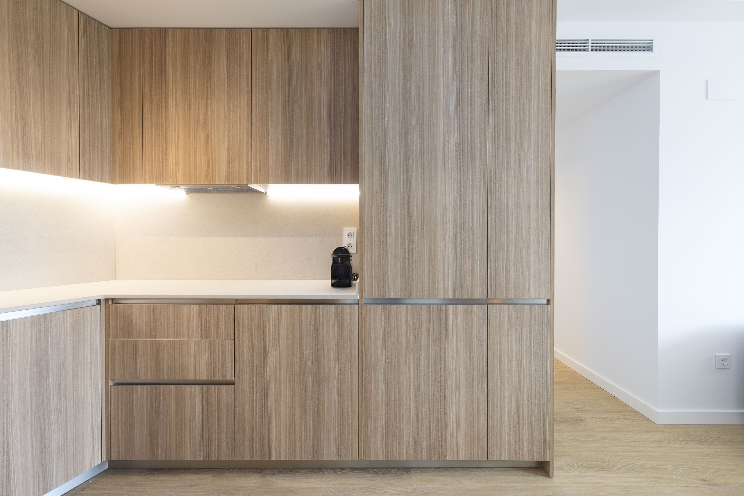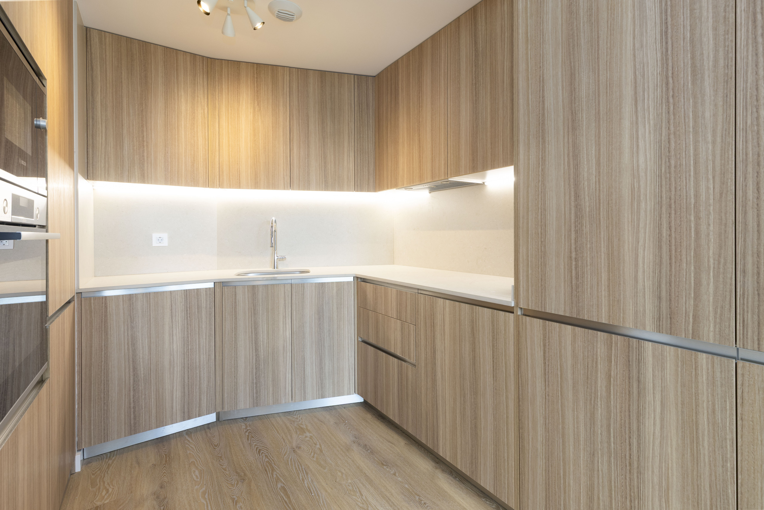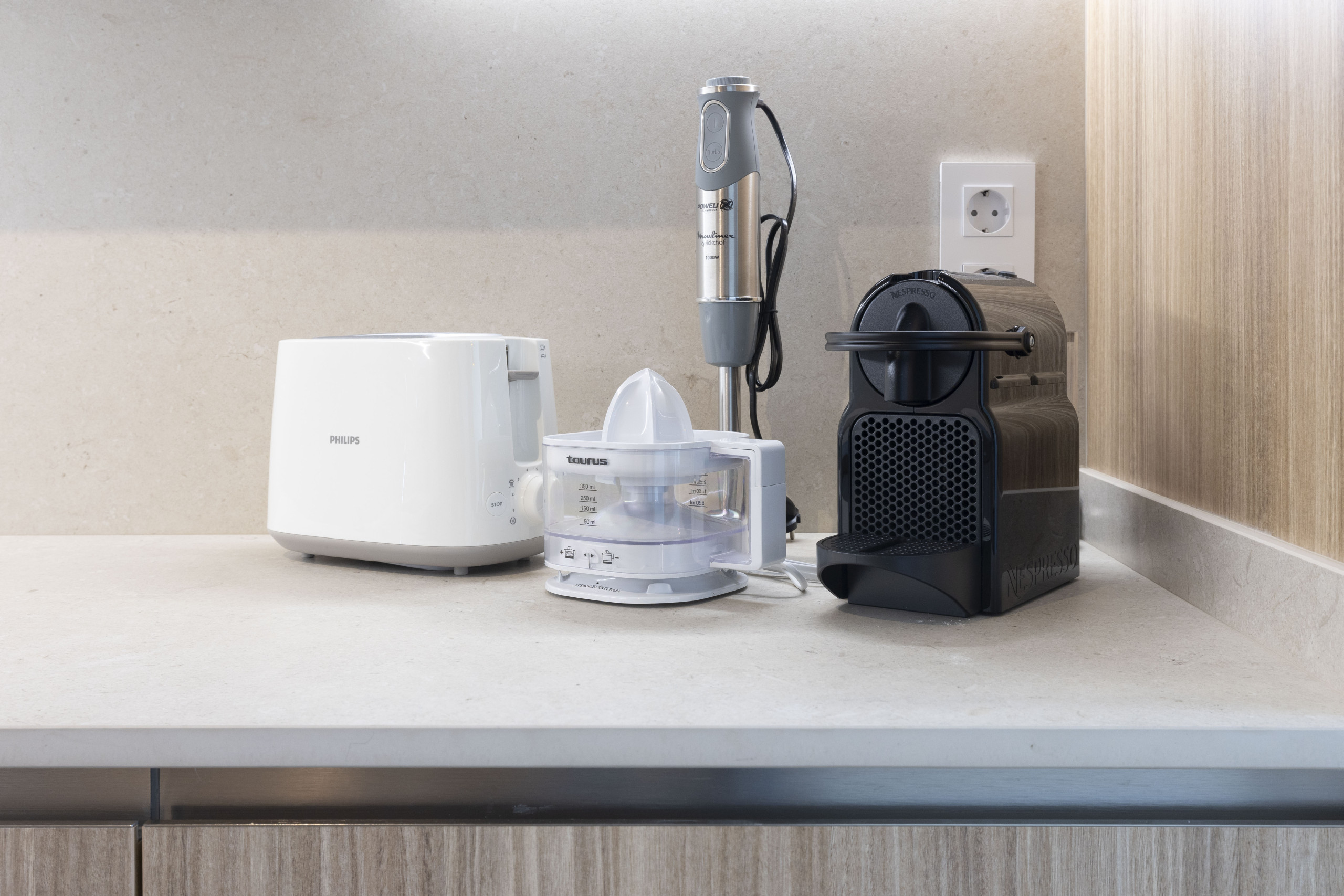 - Modern high-end kitchen with open concept design, including oven, fridge, porcelain worktop with hidden induction Cooking Surface system, microwave, washing machine and small appliances (blender, toaster and kettle), as well as all essential crockery.