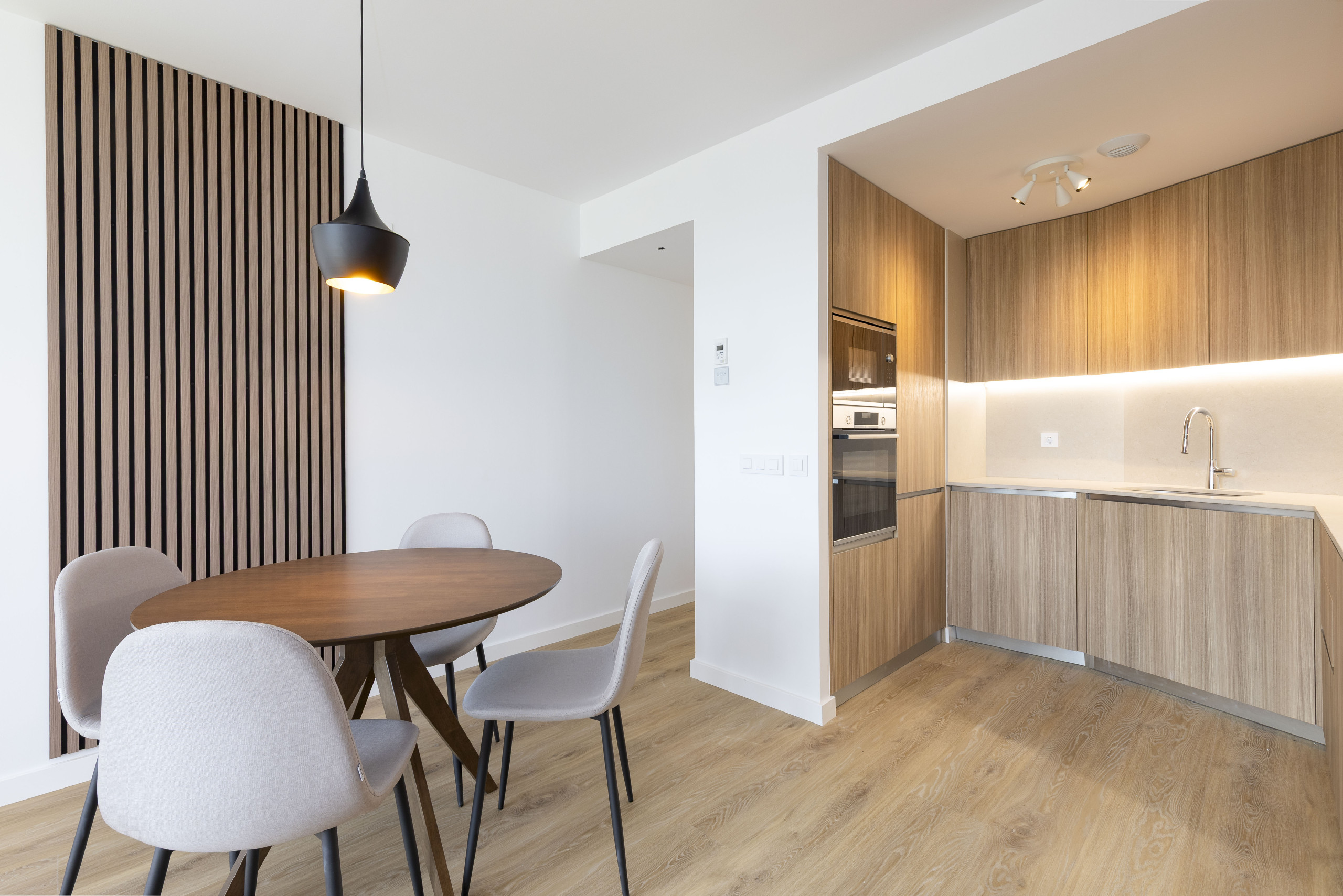 - Spacious and bright living-dining room, with chaise longue sofa, 55" HD Smart TV and round table with four chairs, enhanced by large windows offering pleasant views of the harbour and gardens.