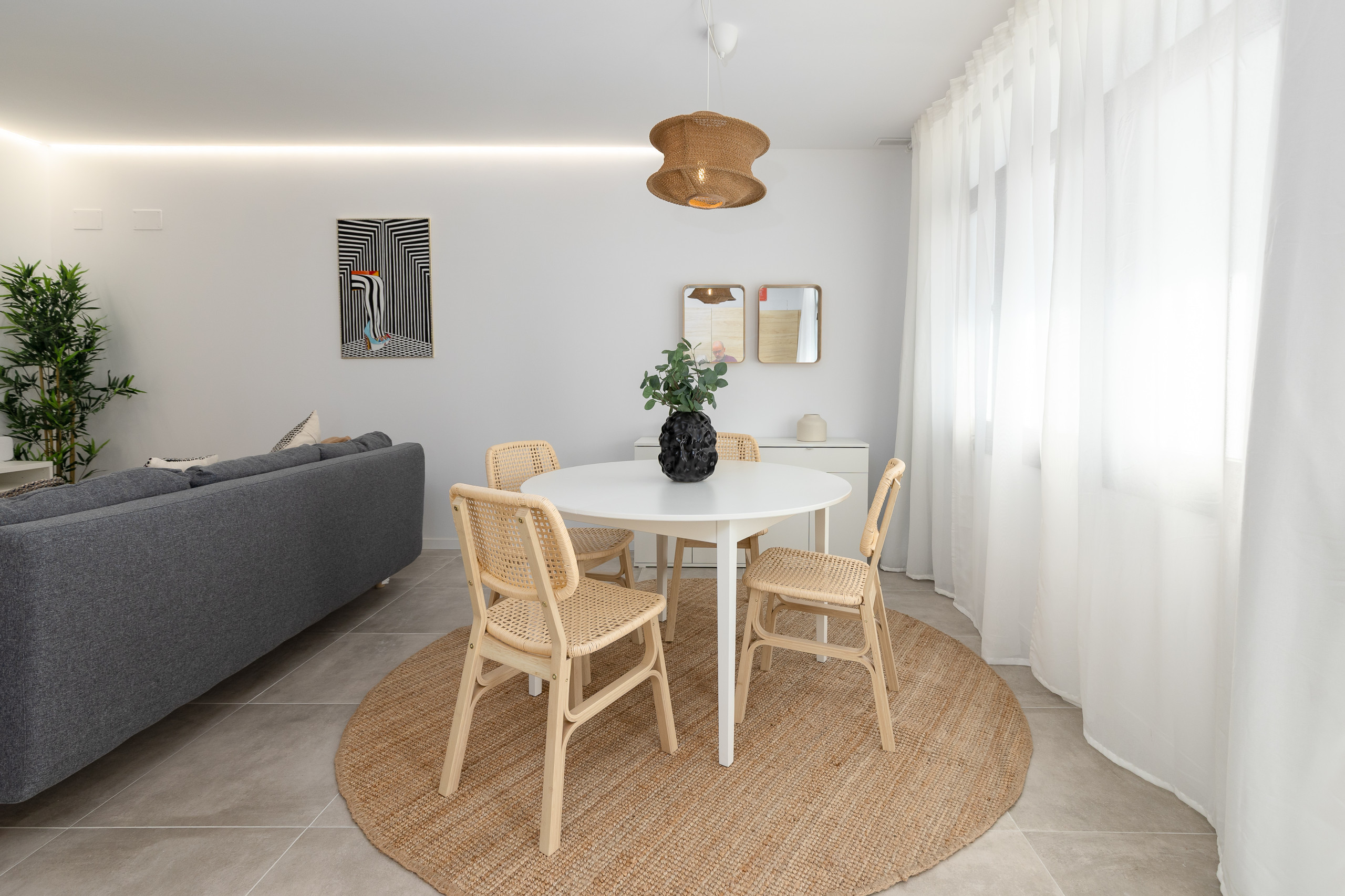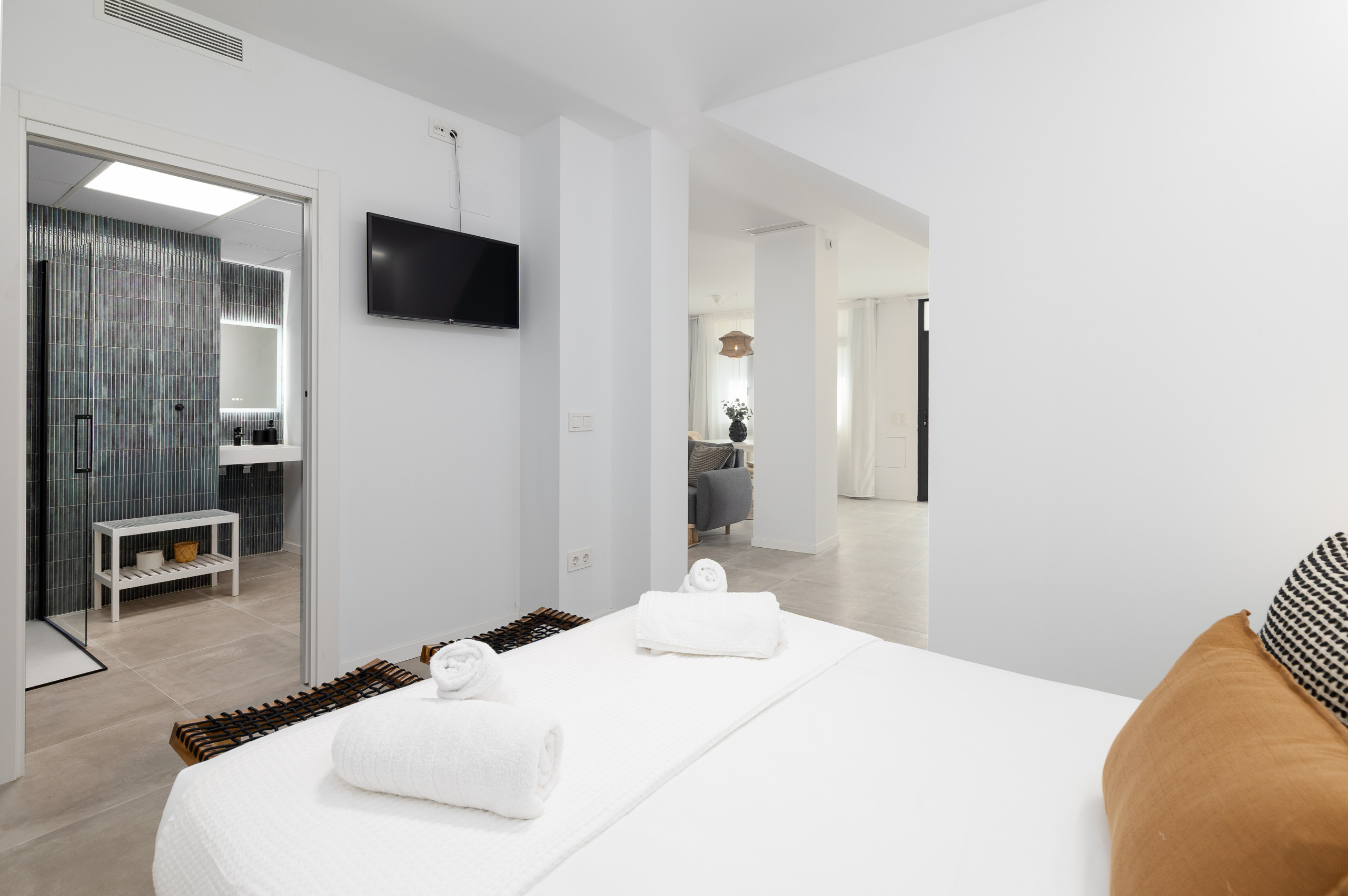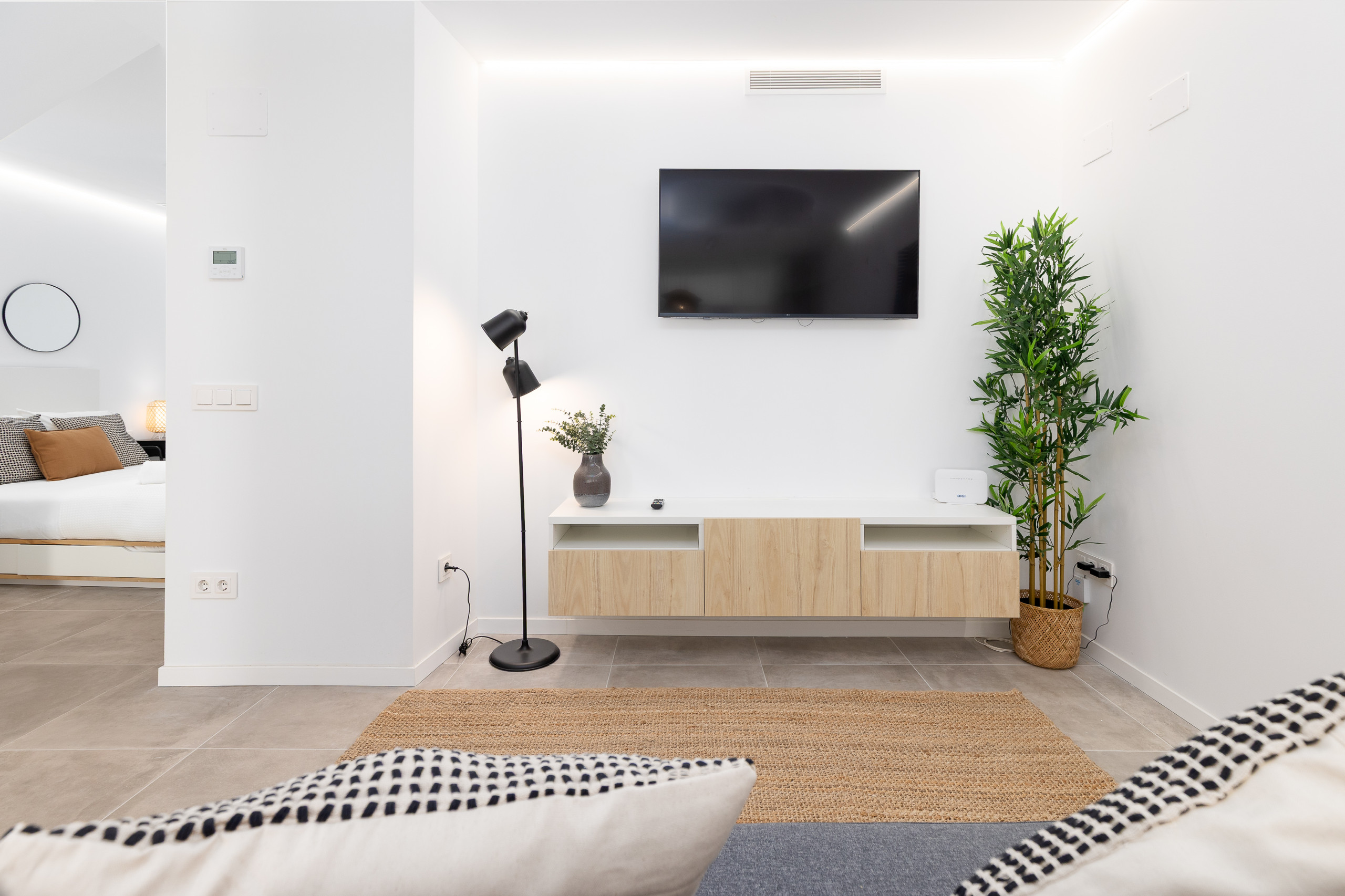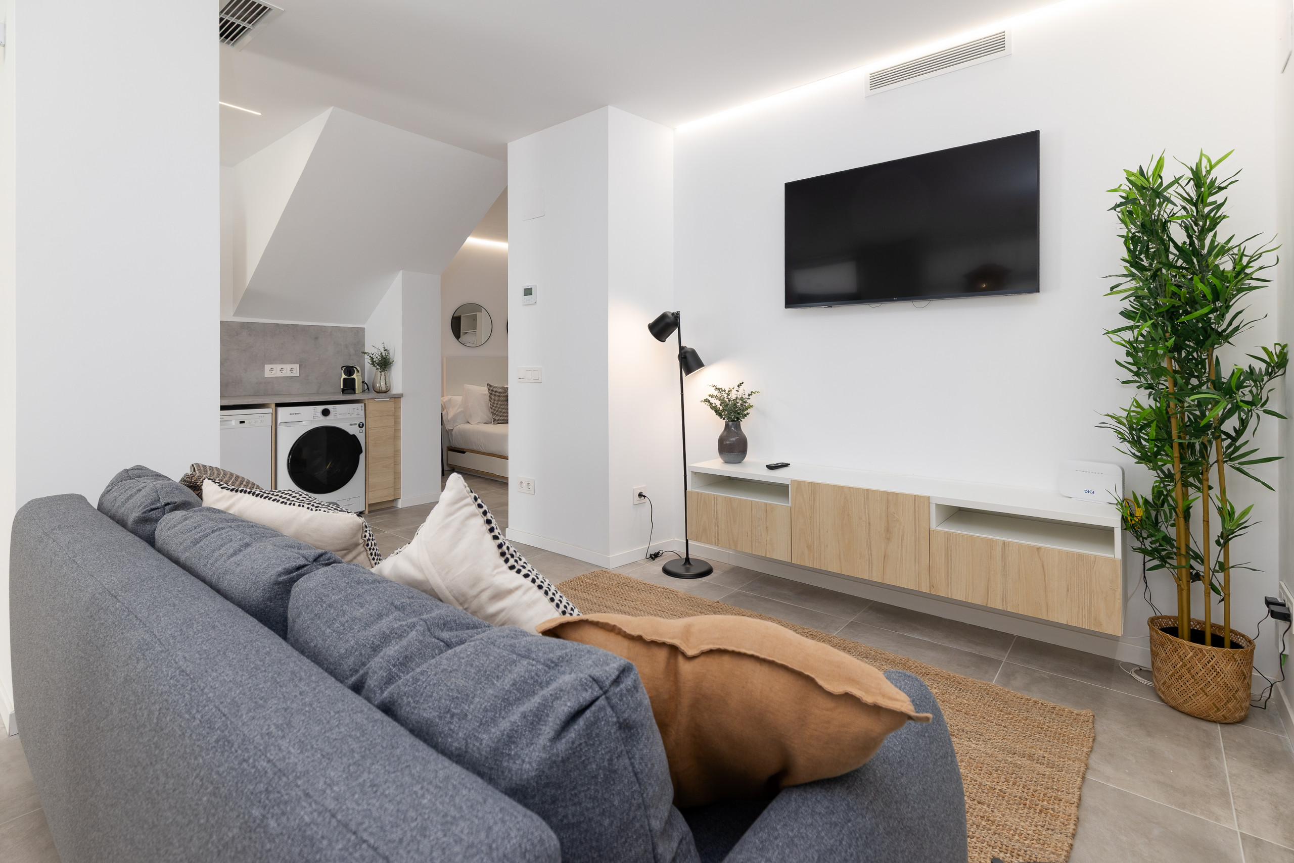 - Living area: Comfortable space with Smart-TV, equipped with a sofa bed of 140cmx190cm and functional furniture with a round dining table integrated into the studio design with capacity for 3 people.