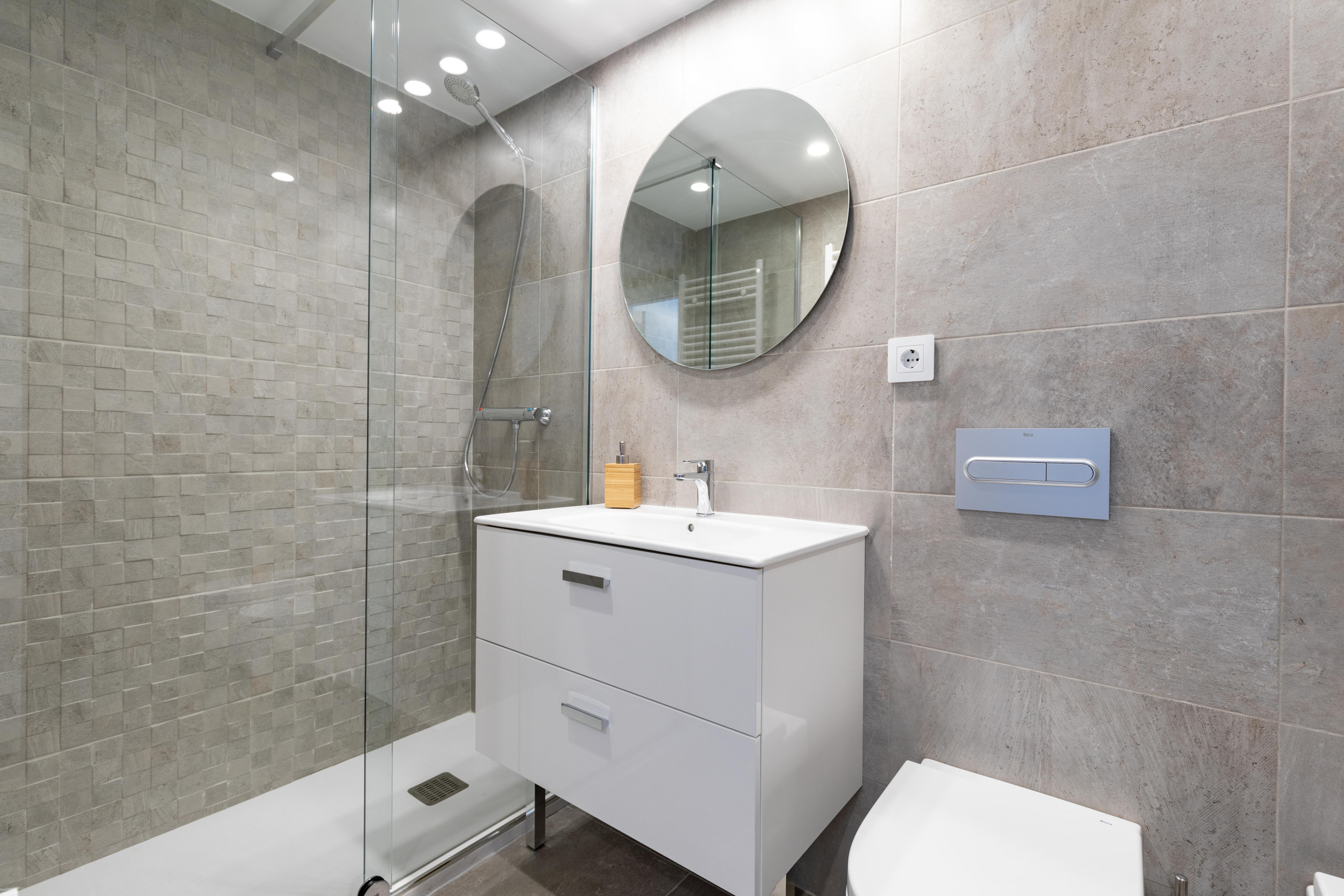 - Deuxième salle de bain équipée d'une douche à l'italienne, d'un grand lavabo, d'un miroir et de toilettes.