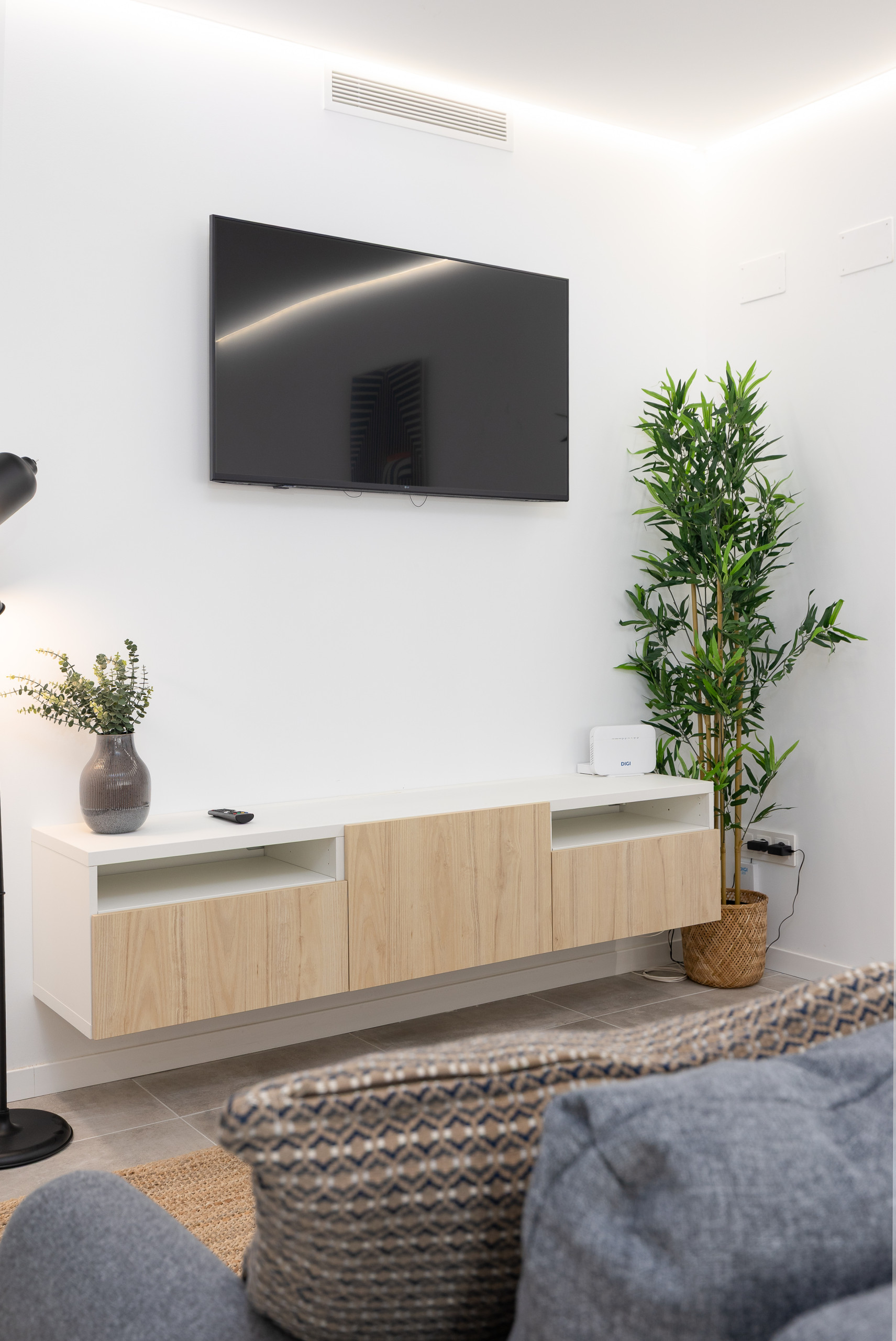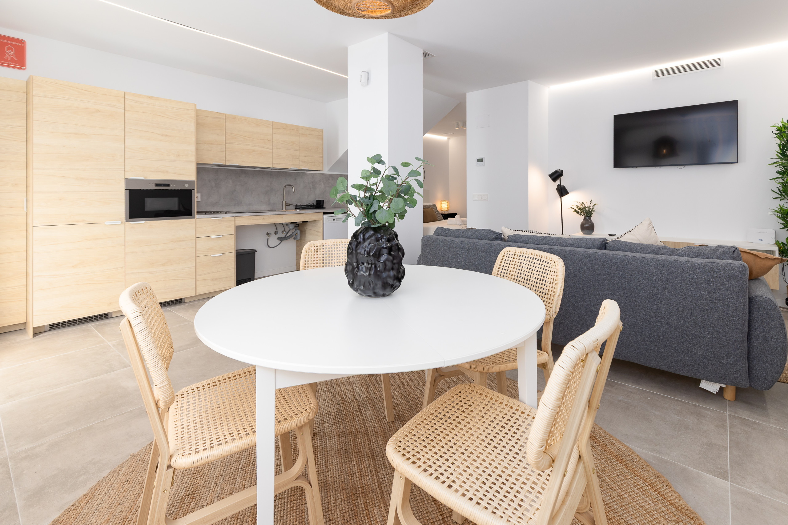 - Espace de vie : Espace confortable avec Smart-TV, équipé d'un canapé-lit de 140cmx190cm et de mobilier fonctionnel avec une table ronde de salle à manger intégrée dans la conception du studio avec une capacité de 3 personnes.